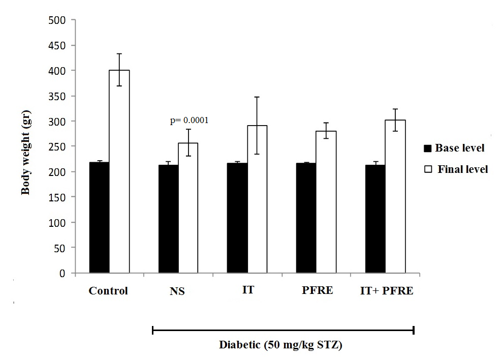 ANOVA test results showed that the induction of diabetes caused a significant decrease in the weight of rats compared to healthy animals (p = 0.0001; F(4) = 30.175 ). Also, the weight of the group subjected to the combination of PFRE consumption and exercise showed a significant increase compared to the diabetic group, but no significant difference was observed between the groups of exercise, PFRE, and the combination of PFRE and exercise (Fig. 1).