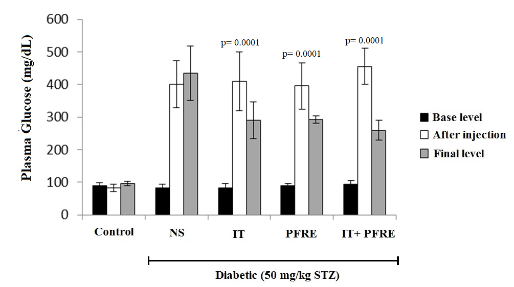 NS= Streptozotocin-induced diabetic rats; IT= Intermittent training; PFRE= Prosopis farcta root extract