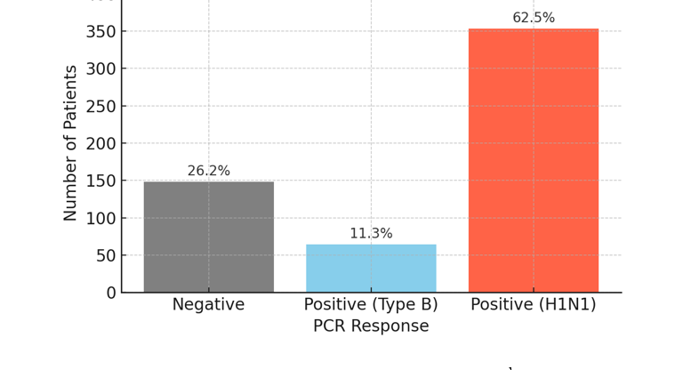 Our study shows that out of a total of 565 patients suspected of having influenza, PCR results were positive for 417 patients (73.8%), of which 64 (11.3%) tested positive for the B strain and 353 (62.5%) for the H1N1 strain, with PCR-negative cases accounting for 26.2%. The remaining patients had other illnesses. This result indicates that H1N1 was the most frequent strain detected.