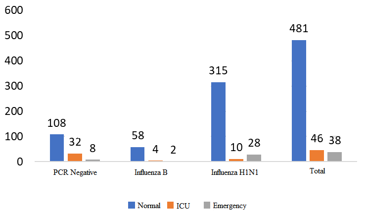 The minimum and maximum lengths of hospitalization were 1 and 45 days, respectively. The most frequent durations of hospitalization were 4 days, 5 days, and 3 days, with frequencies of 114, 113, and 82 patients, respectively. Additionally, 3% of patients required hospitalization for more than 2 weeks. The frequency of PCR results is shown in Table 1. Figure 1 shows the distribution of PCR responses among 565 hospitalized patients. As shown in Table 1 and Figure 1, a positive PCR result was found in 417 patients (73.8%) [the total of positive (type B) and positive (H1N1)]. Figure 2 shows the frequency of patients in the inpatient ward [infectious ward (normal), intensive care unit (ICU), emergency room]. Table 2 illustrates the distribution of patients among the negative PCR, Influenza B, and H1N1 influenza groups according to demographic characteristics, including age range, gender, inpatient department, status of pregnancy, and month of hospitalization.